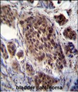 FRAT2 Antibody (C-term) (Cat. #P31006)immunohistochemistry analysis in formalin fixed and paraffin embedded human bladder carcinoma followed by peroxidase conjugation of the secondary antibody and DAB staining.This data demonstrates the use of FRAT2 Antibody (C-term) for immunohistochemistry. Clinical relevance has not been evaluated. |