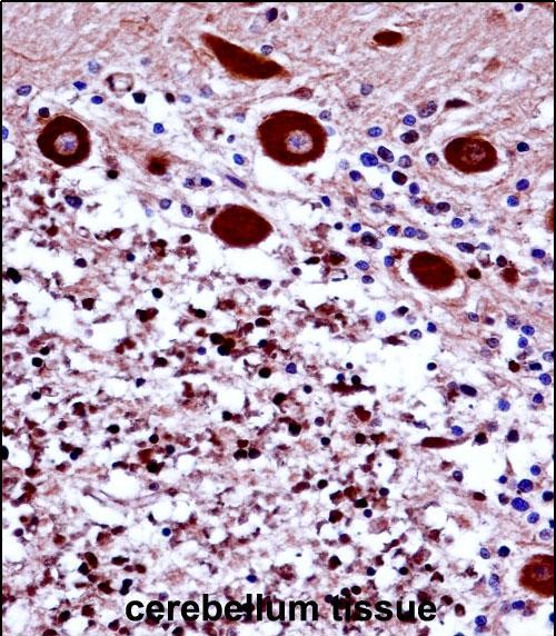 FREQ Antibody (N-term) (P31496)immunohistochemistry analysis in formalin fixed and paraffin embedded human cerebellum tissue followed by peroxidase conjugation of the secondary antibody and DAB staining.This data demonstrates the use of FREQ Antibody (N-term) for immunohistochemistry. Clinical relevance has not been evaluated. |