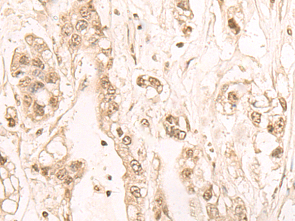 The image is immunohistochemistry of paraffin-embedded Human gastric cancer tissue using P02776(FTSJ3 Antibody) at dilution 1/20. (Original magnification: ×200) |