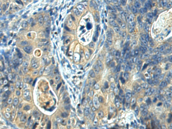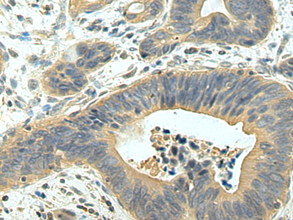The image is immunohistochemistry of paraffin-embedded Human colorectal cancer tissue using P11773(FUT1 Antibody) at dilution 1/35. (Original magnification: ×200) |