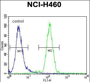 FUT4 Antibody (C-term) (Cat. #P31035) flow cytometric analysis of NCI-H460 cells (right histogram) compared to a negative control cell (left histogram).FITC-conjugated goat-anti-rabbit secondary antibodies were used for the analysis. |