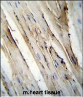 FUT4 Antibody (C-term) (Cat. #P31035)immunohistochemistry analysis in formalin fixed and paraffin embedded mouse heart tissue followed by peroxidase conjugation of the secondary antibody and DAB staining.This data demonstrates the use of FUT4 Antibody (C-term) for immunohistochemistry. Clinical relevance has not been evaluated. |