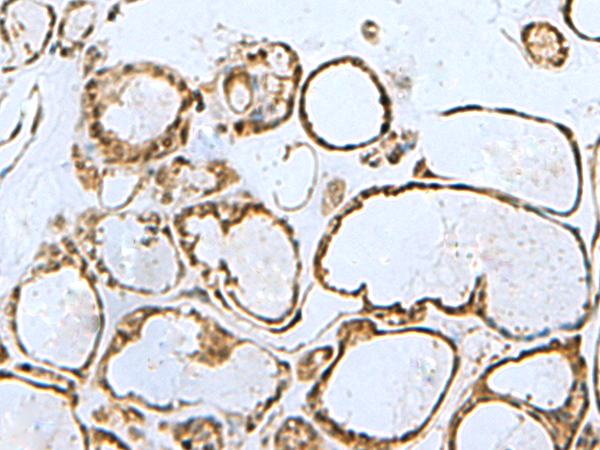 The image is immunohistochemistry of paraffin-embedded Human thyroid cancer tissue using P13438(GABPB1 Antibody) at dilution 1/30. (Original magnification: ×200) |