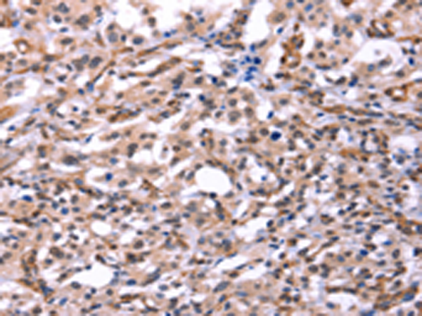 The image is immunohistochemistry of paraffin-embedded Human gasrtic cancer tissue using P11752(GCG(GLP2) Antibody) at dilution 1/40. (Original magnification: ×200) |