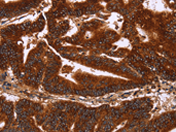 The image is immunohistochemistry of paraffin-embedded Human colon cancer tissue using P04902(GCKR Antibody) at dilution 1/50. (Original magnification: ×200) |