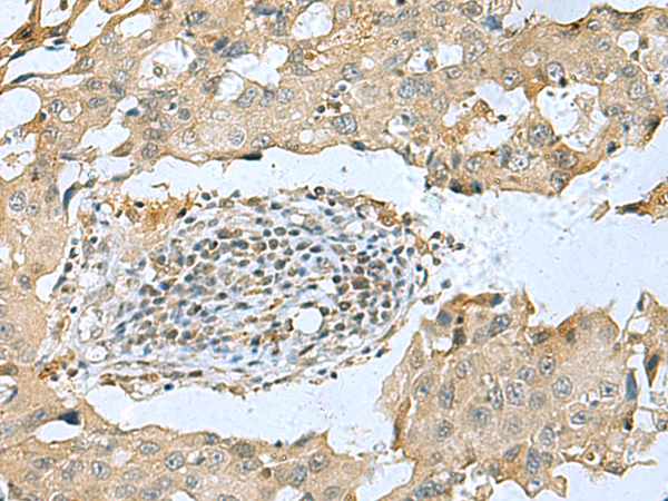 The image is immunohistochemistry of paraffin-embedded Human breast cancer tissue using P12534(GDF10 Antibody) at dilution 1/30. (Original magnification: ×200) |