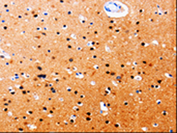 The image is immunohistochemistry of paraffin-embedded Human brain tissue using P06949(GDI1 Antibody) at dilution 1/20. (Original magnification: ×200) |