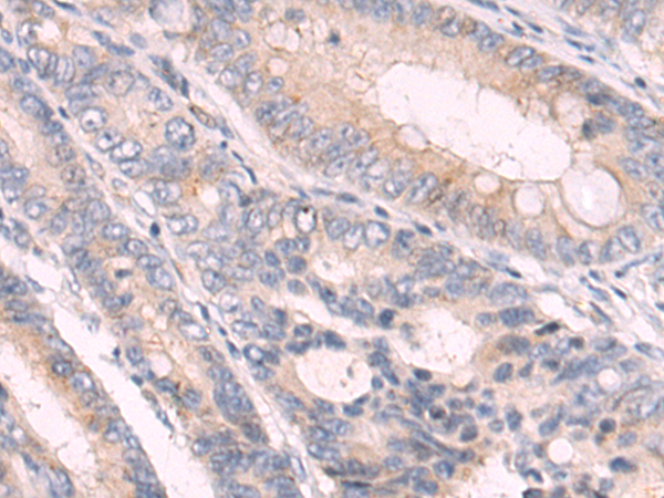 The image is immunohistochemistry of paraffin-embedded Human colorectal cancer tissue using P03987(GFRA3 Antibody) at dilution 1/50. (Original magnification: ×200) |