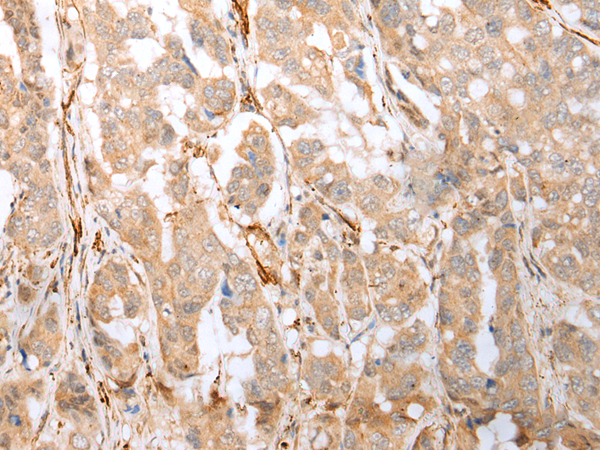 The image is immunohistochemistry of paraffin-embedded Human breast cancer tissue using P05661(GFRA4 Antibody) at dilution 1/20. (Original magnification: ×200) |