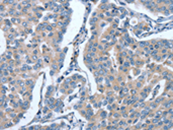 The image is immunohistochemistry of paraffin-embedded Human breast cancer tissue using P04656(GINS1 Antibody) at dilution 1/25. (Original magnification: ×200) |