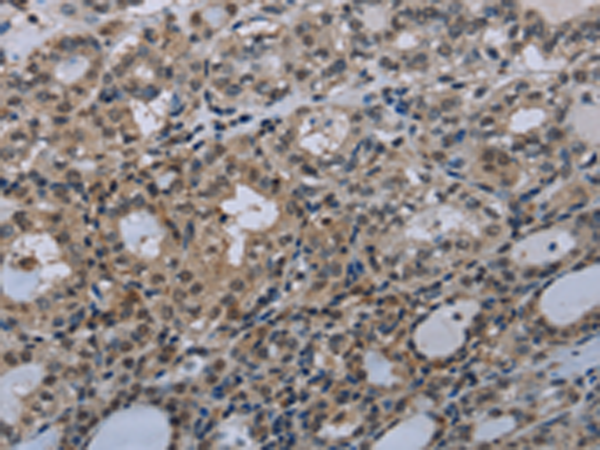 The image is immunohistochemistry of paraffin-embedded Human thyroid cancer tissue using P03846(GJC2 Antibody) at dilution 1/40. (Original magnification: ×200) |