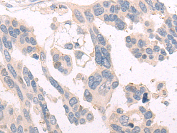 The image is immunohistochemistry of paraffin-embedded Human colorectal cancer tissue using P13803(GJC2 Antibody) at dilution 1/50. (Original magnification: ×200) |