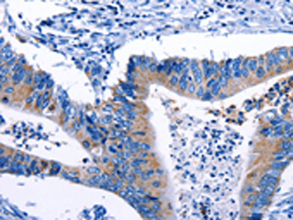 The image is immunohistochemistry of paraffin-embedded Human colon cancer tissue using P03847(Gjc3 Antibody) at dilution 1/10. (Original magnification: ×200) |