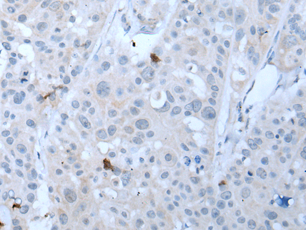 The image is immunohistochemistry of paraffin-embedded Human esophagus cancer tissue using P05858(GKN1 Antibody) at dilution 1/30. (Original magnification: ×200) |