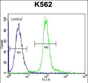 GLMN Antibody (C-term) (Cat. #P31033) flow cytometric analysis of K562 cells (right histogram) compared to a negative control cell (left histogram).FITC-conjugated goat-anti-rabbit secondary antibodies were used for the analysis. |