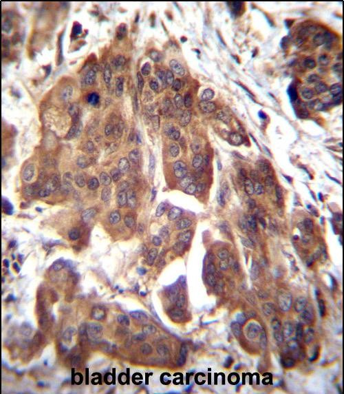 GLMN Antibody (C-term) (Cat. #P31033)immunohistochemistry analysis in formalin fixed and paraffin embedded human bladder carcinoma followed by peroxidase conjugation of the secondary antibody and DAB staining.This data demonstrates the use of GLMN Antibody (C-term) for immunohistochemistry. Clinical relevance has not been evaluated. |