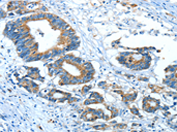 The image is immunohistochemistry of paraffin-embedded Human colon cancer tissue using P11448(GLRA1 Antibody) at dilution 1/30. (Original magnification: ×200) |