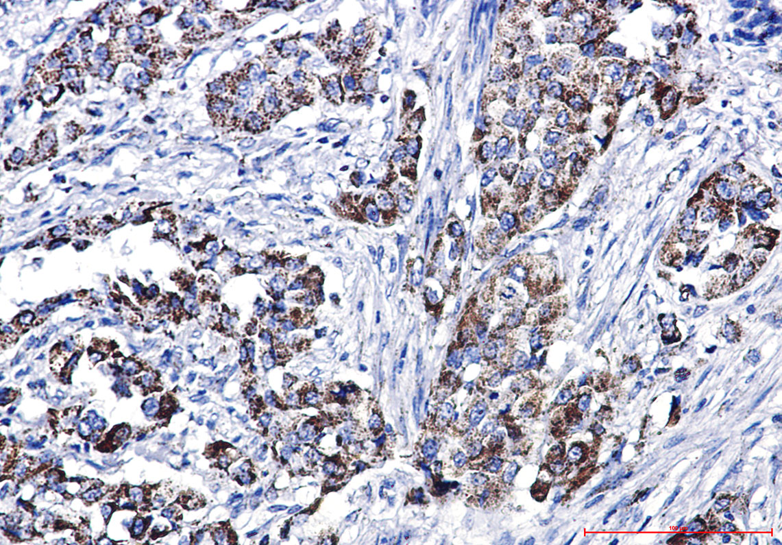 Immunohistochemistry analysis of paraffin-embedded Human lung cancer using Glutaminase antibody.High-pressure and temperature Sodium Citrate pH 6.0 was used for antigen retrieval. |
