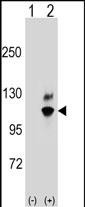 Western blot analysis of GNL2 (arrow) using rabbit polyclonal GNL2 Antibody (N-term) (Cat. #P31644). 293 cell lysates (2 ug/lane) either nontransfected (Lane 1) or transiently transfected (Lane 2) with the GNL2 gene. |