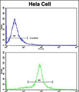Flow cytometric analysis of hela cells using GOLPH3 Antibody (C-term)(bottom histogram) compared to a negative control cell (top histogram). FITC-conjugated goat-anti-rabbit secondary antibodies were used for the analysis. |