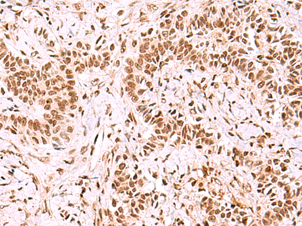 The image is immunohistochemistry of paraffin-embedded Human ovarian cancer tissue using P03178(GPKOW Antibody) at dilution 1/100. (Original magnification: ×200) |