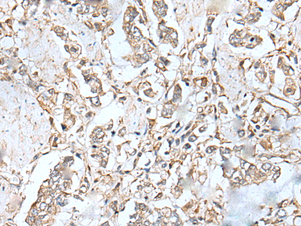 The image is immunohistochemistry of paraffin-embedded Human gastric cancer tissue using P05384(GPR15 Antibody) at dilution 1/25. (Original magnification: ×200) |