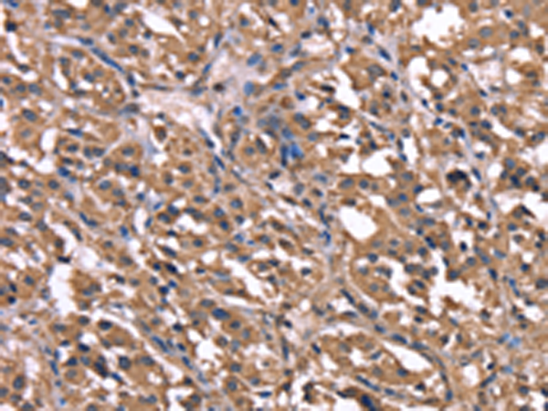 The image is immunohistochemistry of paraffin-embedded Human thyroid cancer tissue using P11804(GPR65 Antibody) at dilution 1/20. (Original magnification: ×200) |
