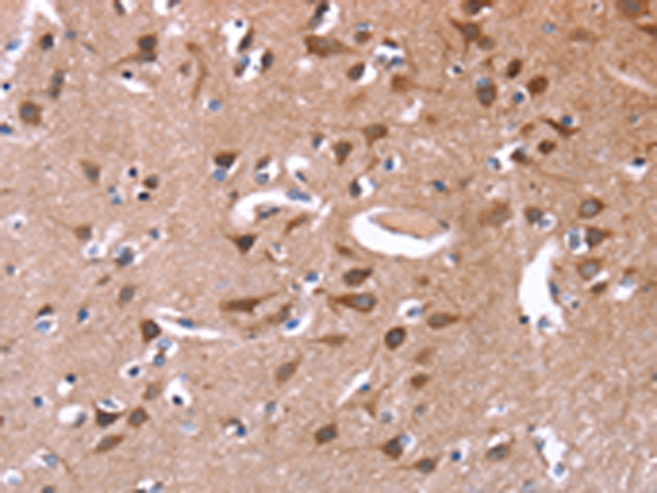 The image is immunohistochemistry of paraffin-embedded Human brain tissue using P11805(GREB1 Antibody) at dilution 1/50. (Original magnification: ×200) |