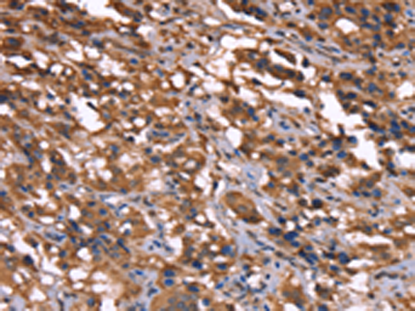 The image is immunohistochemistry of paraffin-embedded Human thyroid cancer tissue using P04919(GREB1 Antibody) at dilution 1/40. (Original magnification: ×200) |