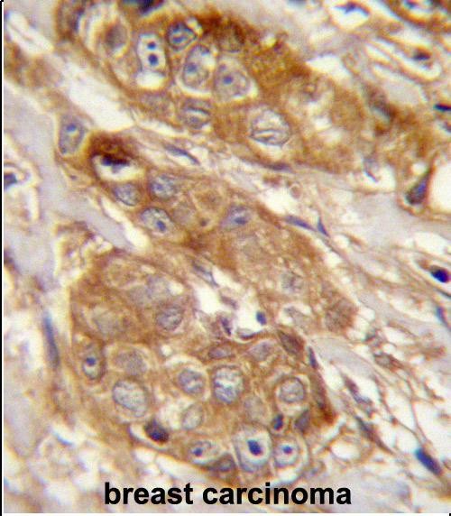 GRINA Antibody (Center) (Cat. #P31310)immunohistochemistry analysis in formalin fixed and paraffin embedded human breast carcinoma followed by peroxidase conjugation of the secondary antibody and DAB staining.This data demonstrates the use of GRINA Antibody (Center) for immunohistochemistry. Clinical relevance has not been evaluated. |