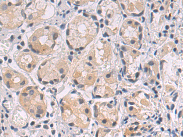 The image is immunohistochemistry of paraffin-embedded Human gastric cancer tissue using P05696(GRM5 Antibody) at dilution 1/50. (Original magnification: ×200) |