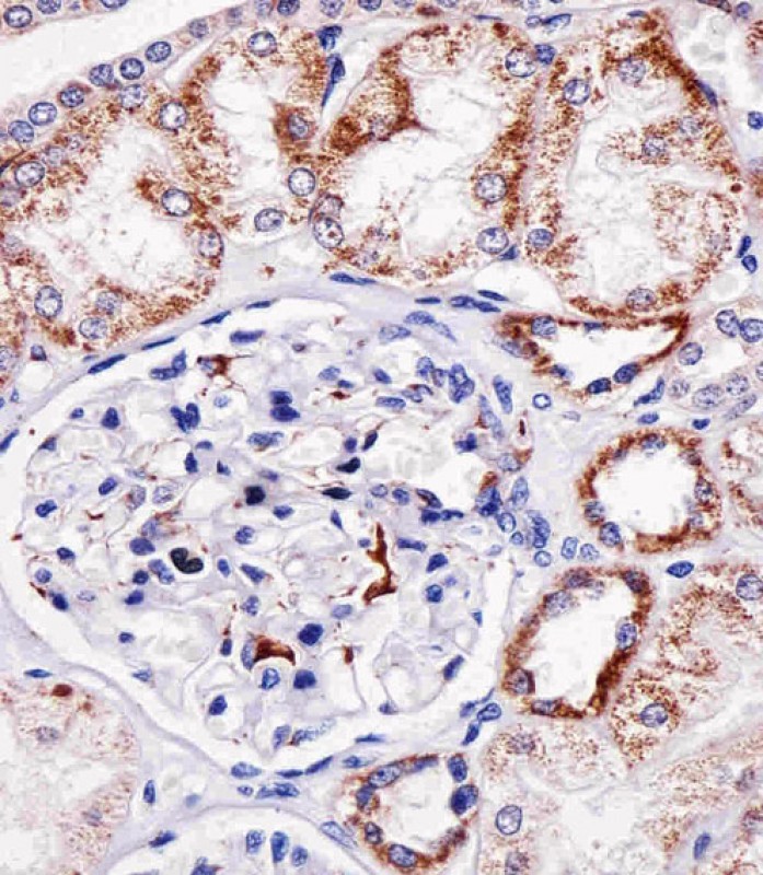 Immunohistochemical analysis of paraffin-embedded H. kidney section using GRN Antibody (C-term)(Cat#P32493). P32493 was diluted at 1:25 dilution. A undiluted biotinylated goat polyvalent antibody was used as the secondary, followed by DAB staining. |