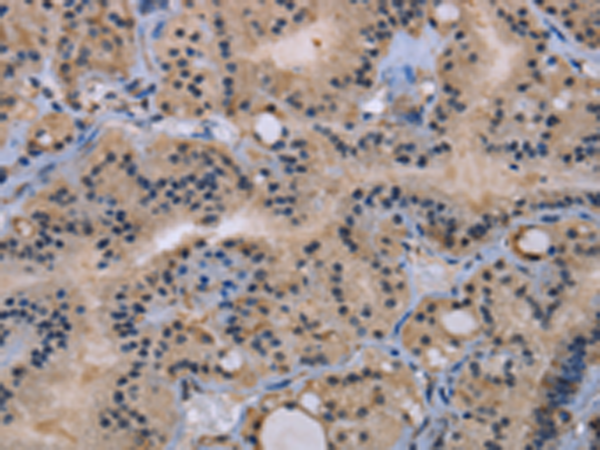 The image is immunohistochemistry of paraffin-embedded Human thyroid cancer tissue using P03984(GSN Antibody) at dilution 1/40. (Original magnification: ×200) |