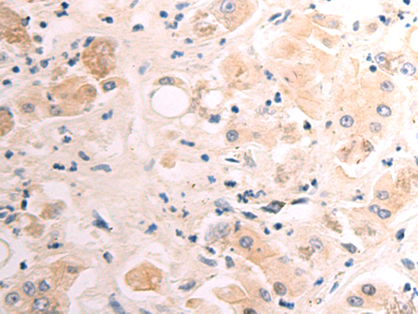 The image is immunohistochemistry of paraffin-embedded Human liver cancer tissue using P03502(GSTM5 Antibody) at dilution 1/50. (Original magnification: ×200) |