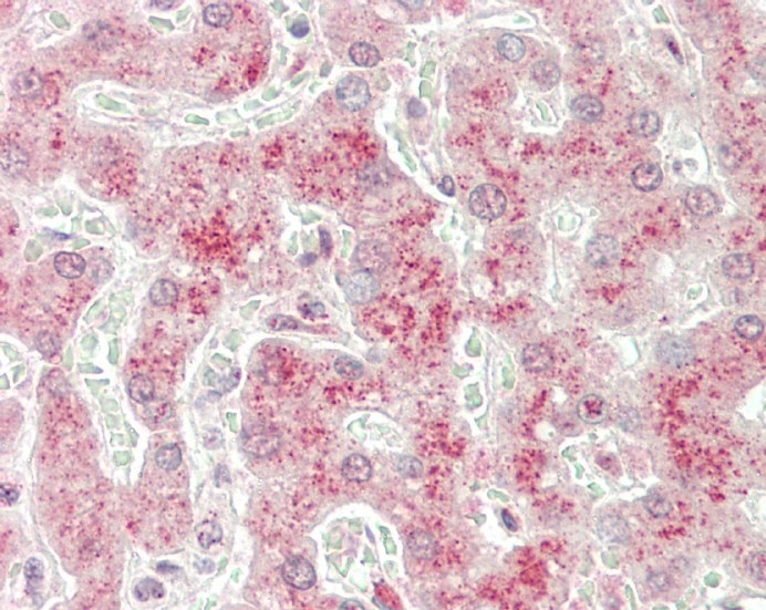 Formalin-fixed and paraffin-embedded H.liver tissue reacted with GSTT2 Antibody(Center) (Cat#P32249). |