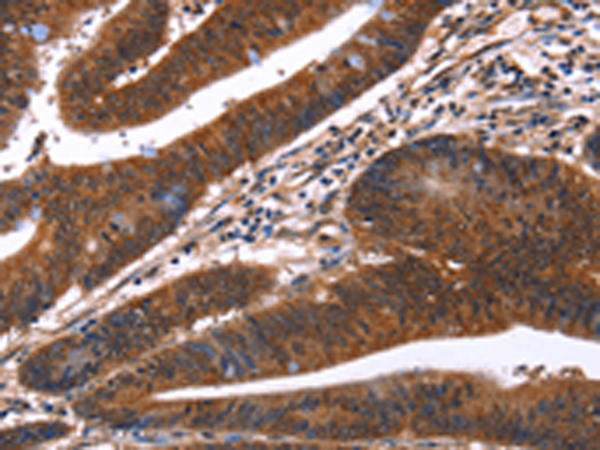 The image is immunohistochemistry of paraffin-embedded Human colon cancer tissue using P04920(GUK1 Antibody) at dilution 1/40. (Original magnification: ×200) |