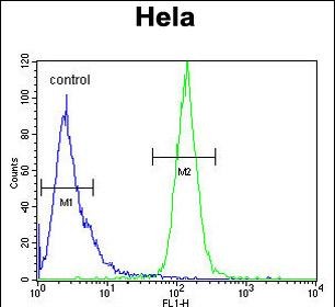 H2AFY2 Antibody (N-term) (Cat. #P30836) flow cytometric analysis of Hela cells (right histogram) compared to a negative control cell (left histogram).FITC-conjugated goat-anti-rabbit secondary antibodies were used for the analysis. |