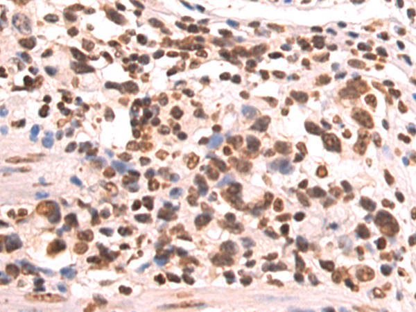 The image is immunohistochemistry of paraffin-embedded Human gastric cancer tissue using P12816(HAND1 Antibody) at dilution 1/50. (Original magnification: ×200) |