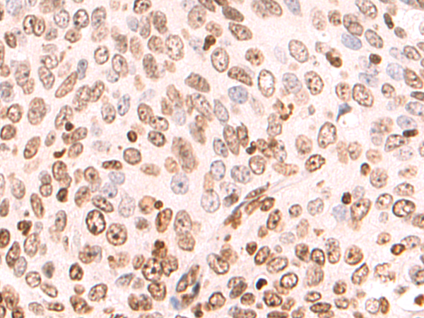 The image is immunohistochemistry of paraffin-embedded Human cervical cancer tissue using P12816(HAND1 Antibody) at dilution 1/50. (Original magnification: ×200) |