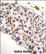 HAUS3 Antibody (Center) (Cat. #P30943)immunohistochemistry analysis in formalin fixed and paraffin embedded human testis tissue followed by peroxidase conjugation of the secondary antibody and DAB staining.This data demonstrates the use of HAUS3 Antibody (Center) for immunohistochemistry. Clinical relevance has not been evaluated. |