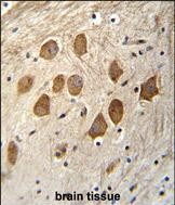 HCFC1R1 Antibody (N-term) (Cat. #P30981)immunohistochemistry analysis in formalin fixed and paraffin embedded human brain tissue followed by peroxidase conjugation of the secondary antibody and DAB staining.This data demonstrates the use of HCFC1R1 Antibody (N-term) for immunohistochemistry. Clinical relevance has not been evaluated. |