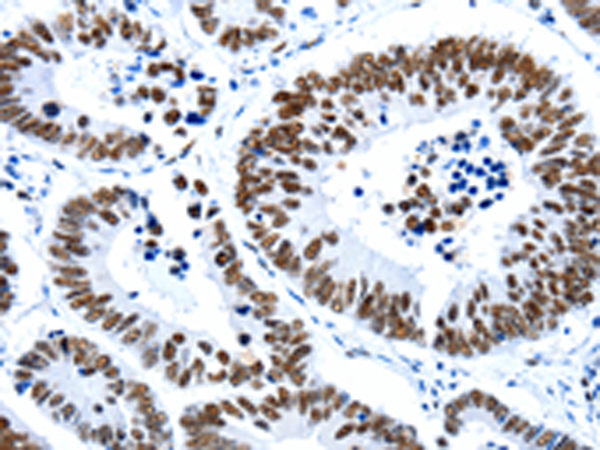 The image is immunohistochemistry of paraffin-embedded Human colon cancer tissue using P04023(HDAC2 Antibody) at dilution 1/17. (Original magnification: ×200) |