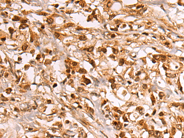 The image is immunohistochemistry of paraffin-embedded Human gastric cancer tissue using P13725(HDAC7 Antibody) at dilution 1/35. (Original magnification: ×200) |