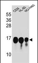 HIST1H2BJ Antibody (Center) (Cat. #P32705) western blot analysis in CEM,HL-60,NCI-H460 cell line lysates (35ug/lane).This demonstrates the HIST1H2BJ antibody detected the HIST1H2BJ protein (arrow). |