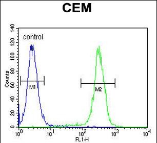 HIST1H2BJ Antibody (Center) (Cat. #P32705) flow cytometric analysis of CEM cells (right histogram) compared to a negative control cell (left histogram).FITC-conjugated goat-anti-rabbit secondary antibodies were used for the analysis. |
