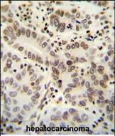 HIST1H2BJ antibody (Center) (Cat. #P32705) immunohistochemistry analysis in formalin fixed and paraffin embedded human hepatocarcinoma followed by peroxidase conjugation of the secondary antibody and DAB staining. This data demonstrates the use of the HIST1H2BJ antibody (Center) for immunohistochemistry. Clinical relevance has not been evaluated. |