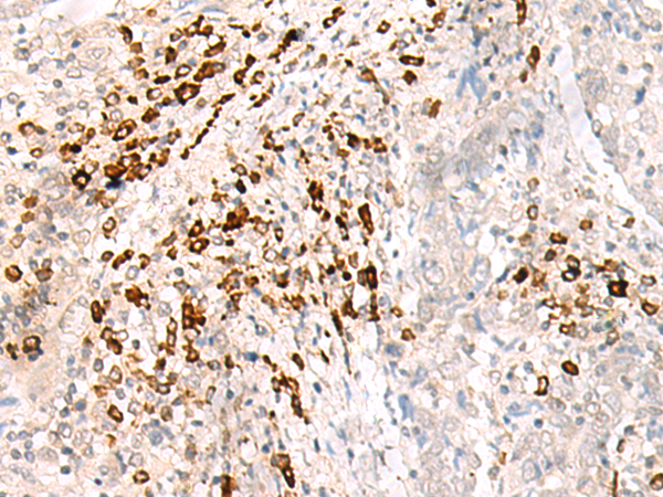 The image is immunohistochemistry of paraffin-embedded Human cervical cancer tissue using P06460(HLA-B Antibody) at dilution 1/30. (Original magnification: ×200) |