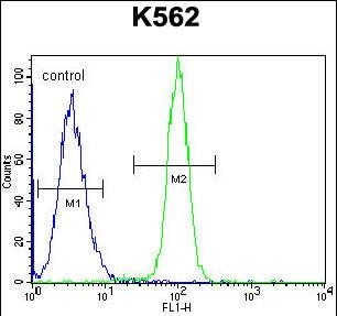 HMG1L10 Antibody (N-term) (Cat. #P31051) flow cytometric analysis of K562 cells (right histogram) compared to a negative control cell (left histogram).FITC-conjugated goat-anti-rabbit secondary antibodies were used for the analysis. |