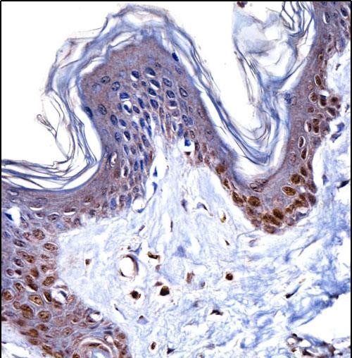 HMGN1 Antibody (N-term) (P31416)immunohistochemistry analysis in formalin fixed and paraffin embedded human skin tissue followed by peroxidase conjugation of the secondary antibody and DAB staining.This data demonstrates the use of HMGN1 Antibody (N-term) for immunohistochemistry. Clinical relevance has not been evaluated. |