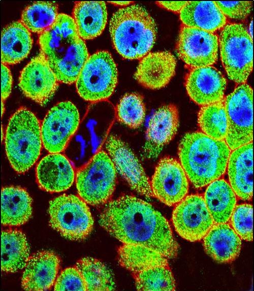Confocal immunofluorescent analysis of HN1 Antibody (Center)(Cat#P31535) with A549 cell followed by Alexa Fluor 488-conjugated goat anti-rabbit lgG (green).Actin filaments have been labeled with Alexa Fluor 555 phalloidin (red).DAPI was used to stain the cell nuclear (blue). |